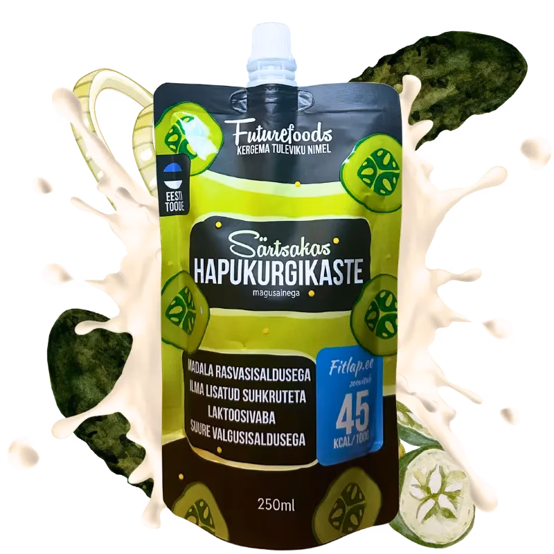 Koostisosad: laktoosivaba JOGURT (74%), hapukurk (19%) (kurk, sool, suhkur, happesuse regulaator: äädikhape), magusaine: erütritool, sool, maitseained, paksendaja: ksantaankummi, SINEPIpulber, SINEPIseemned, happesuse regulaator: askorbiinhape, säilitusaine: kaaliumsorbaat